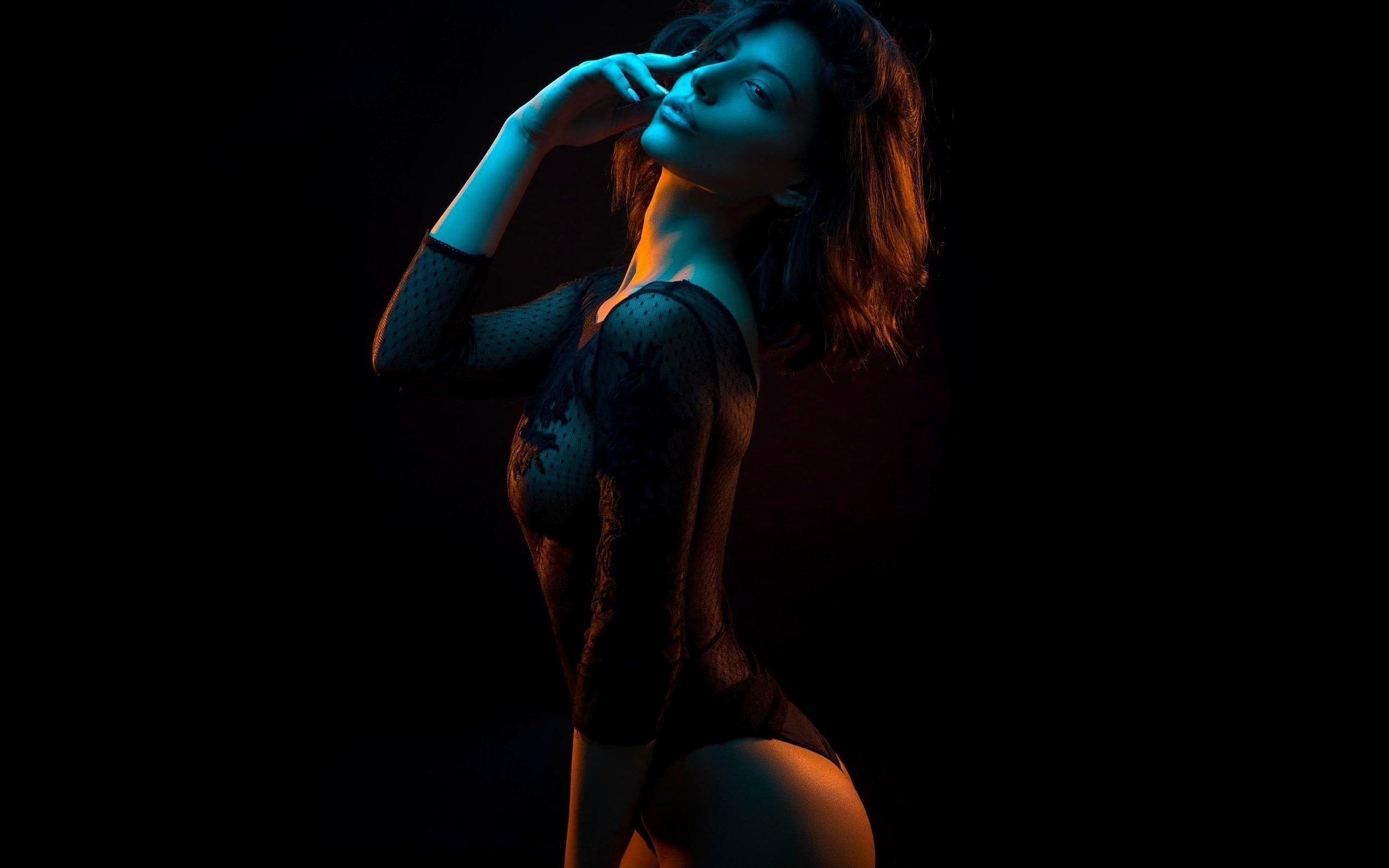 Girl in linen on a black background