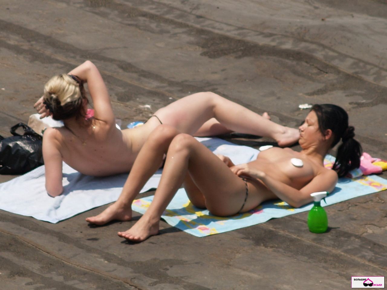 Girls with big breasts sunbathe topless