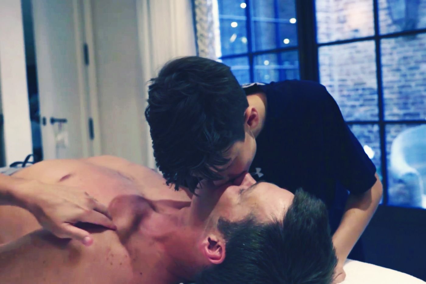 Men hug in bed